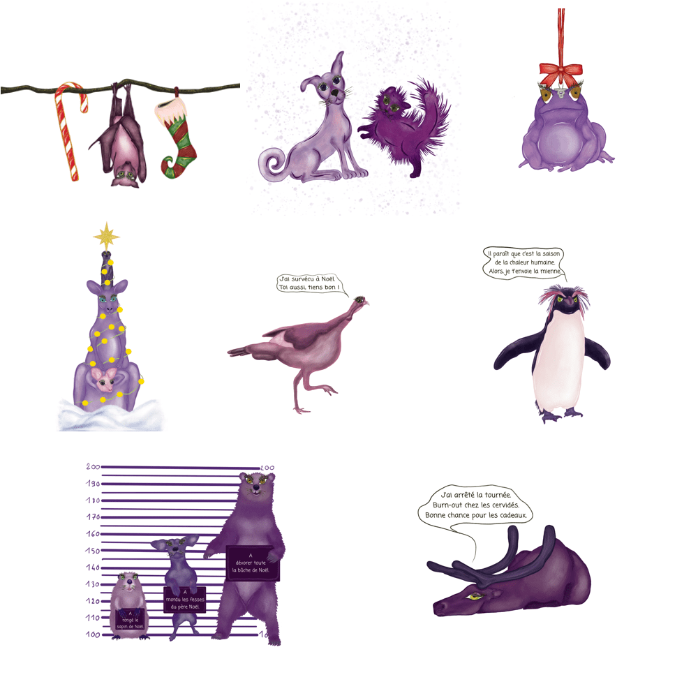 Après plusieurs semaines de croquis, de tests de couleurs et de petits ajustements, les huit illustrations finales sont prêtes à prendre vie sur papier. Comme toujours, les animaux sont les stars de cette collection – chacun porteur d’une touche de tendresse et d’humour.